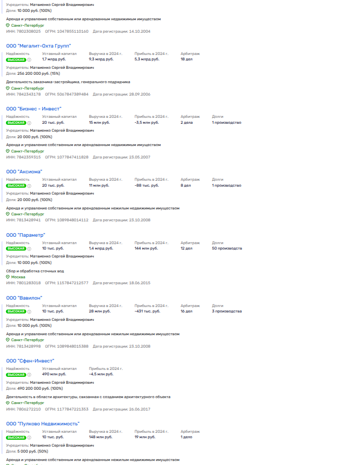То самое АО было прописано в Петербурге по адресу здания (Большой просп. Васильевского острова, 10), которое принадлежит другой компании Матвиенко - ООО «Вавилон».