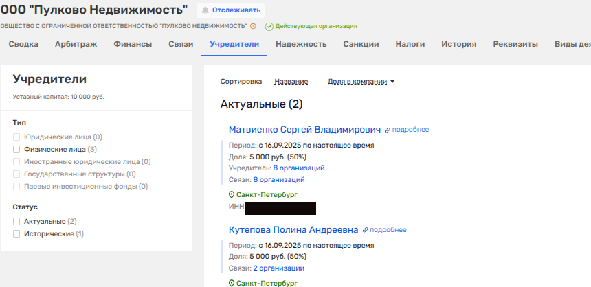Сергей Матвиенко на имеющемся бизнес-портфеле не останавливается. Так, 16 сентября 2025 года он прикупил 50% доли в «Пулково Недвижимость» в Санкт-Петербурге (ранее ООО «СТО Косыгина»). Партнером по бизнесу стала Кутепова Полина Андреевна, родственница Оксаны Адольфовны Кутеповой.