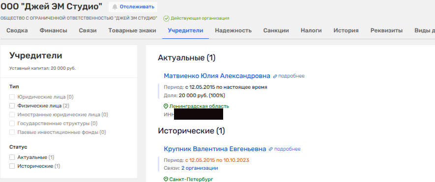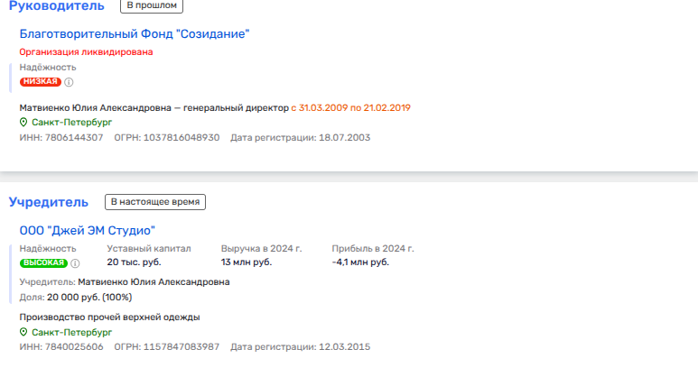 Кстати, Юлия Матвиенко, с которой он пересекался через благотворительный фонд «Созидание», ликвидированный в 2019 году, имеет также долю в ООО «Джей ЭМ Студио» (производство верхней одежды). Директором в фирме на сегодня, а также ранее и бизнес-партнером является Валентина Крупник. Последняя - тезка жены депутата Заксобрания Санкт-Петербурга двух созывов Павла Крупника, который также был советником вице-губернатора Санкт-Петербурга Аллы Маниловой при губернаторстве матери Матвиенко.
