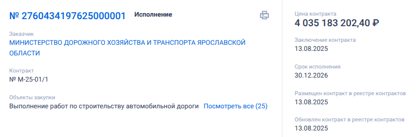 В августе 2025 года Миндортранс Ярославской области подписал контракт на сумму 4,03 млрд рублей. Речь идёт об одном из этапов реконструкции Московского проспекта со строительством транспортных развязок и мостового перехода через р. Волгу в составе обхода центральной части Ярославля. Срок действия контракта - 30.12.2026 год.