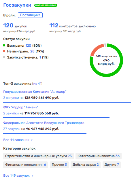 Победителем признали московское ООО «Трансстроймеханизация», учрежденное в 2005 году, но до февраля 2025 года имеющее основной вид деятельности - производство прочих строительно-монтажных работ. Сейчас же ООО вдруг стало специализироваться на дорожной стройке. В целом с фирмой подписано 112 госконтрактов на 381 млрд рублей.