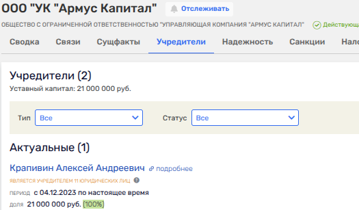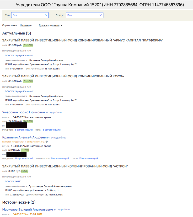 Постепенно в ООО «Группа компаний 1520» бенефициаров стали прятать за ЗПИФ. На сегодня доля Ушеровича - 24,83%, Крапивина - около 5%. Все остальное распределено между ЗПИФами, но вот же фокус - управляют теми ЗПИФ ООО УК «Армус Капитал», которое Алексей Крапивин выкупил в 2023 году, и ООО УК «НИТ», которое приобрел тогда же Кирилл Борисович Ушерович - сын бегунка от следствия. Комментарии, как говорится, излишни. Все намекает на простую попытку скрыть реальных получателей миллиардов от госконтрактов.