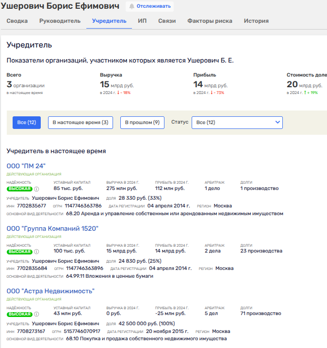 Занятно и то, что на самого Бориса Ушеровича в России оформлена не только доля в группе 1520, но и в ООО «ПМ 24», ООО «Астра Недвижимость». При этом в первой его партнером проходит все тот же Крапивин и родня умершего в 2023 году Маркелова. Также пачка фирм оформлена на Кирилла Ушеровича.