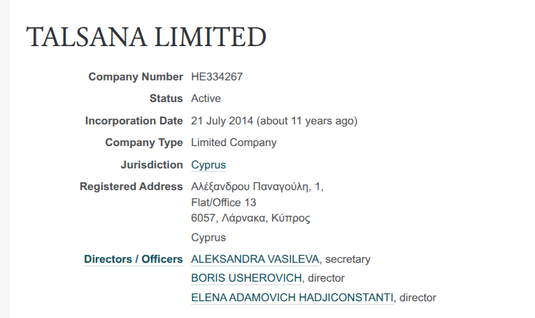 И VASILEVA, и ADAMOVICH - еще и руководители кипрской TALSANA LIMITED. И там же дополняет их BORIS USHEROVICH. На последнем числятся и связи с целой пачкой американских и кипрских фирм, в том числе BGU INNOVATIONS INC. (New York), MEGATEL INTERNATIONAL NEW YORK, INC. (New York), PATENT DEVELOPMENT CORPORATION (New York), WENDALL SERVICES LIMITED (Cyprus), MAVORSAND INVEST LIMITED (Cyprus).