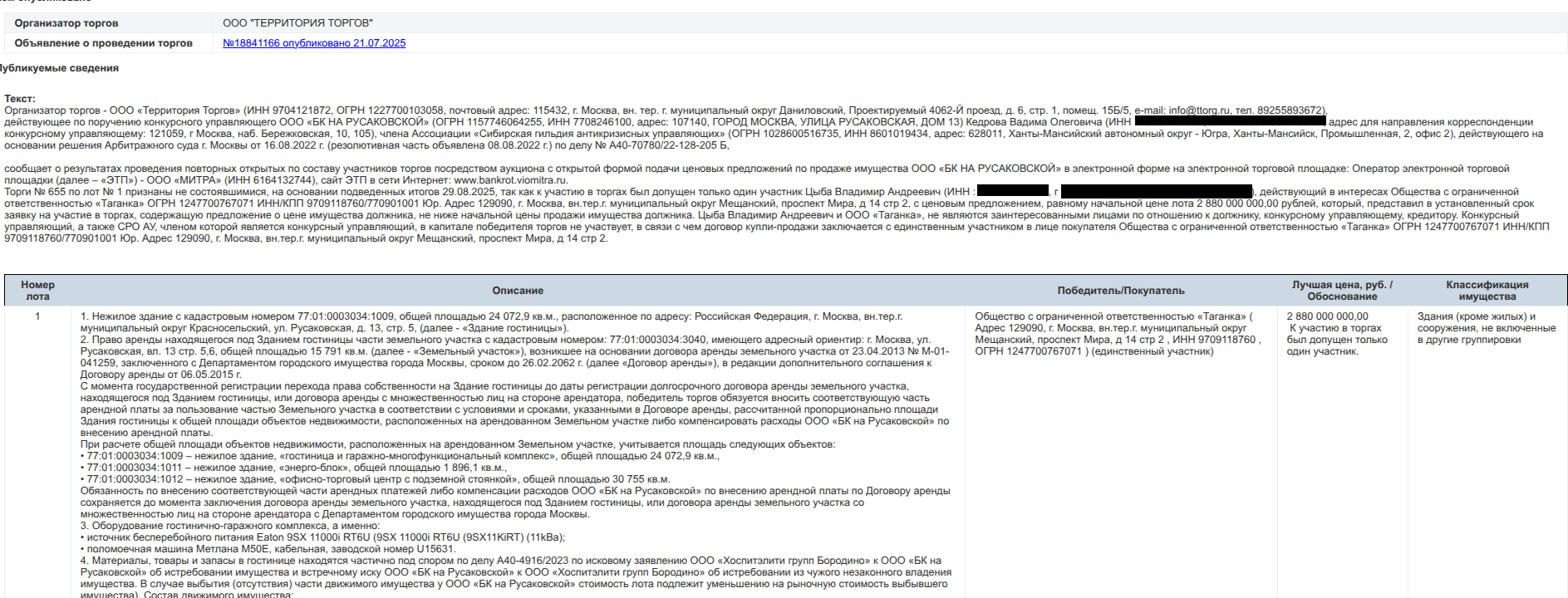 2 сентября с молотка по продаже активов банкротящегося ООО «БК НА РУСАКОВСКОЙ» была продана гостиница «Альянс Бородино» в Москве общей площадью 24 072,9 кв.м со всем содержимым и правом аренды госучастка.