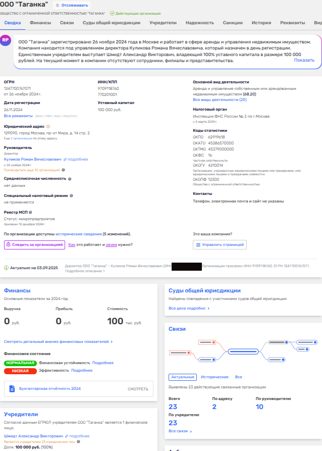 Здание было выкуплено за 2,88 млрд рублей годовалой компанией «Таганка», которая стала единственным участником и забрала актив без конкуренции. При этом уставный капитал фирмы всего 100 тыс. рублей, а выручка за 2024 год - 0.