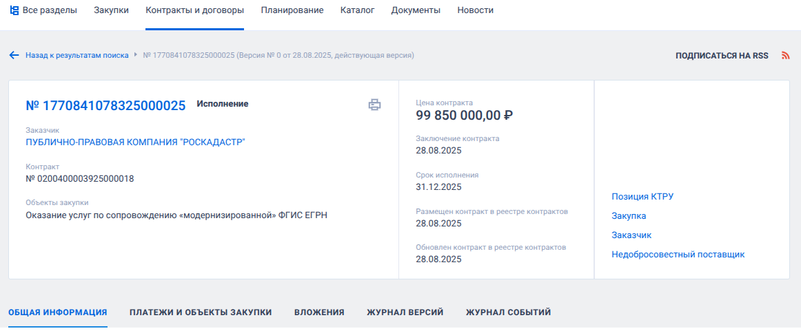 Роскадастр 28 августа 2025 года подписал контракт почти на 100 млн рублей - на оказание услуг по сопровождению «модернизированной» ФГИС ЕГРН (единого госреестра недвижимости). Победителем признали ООО «Бюджетные и финансовые технологии» (БФТ) из Белгородской области.