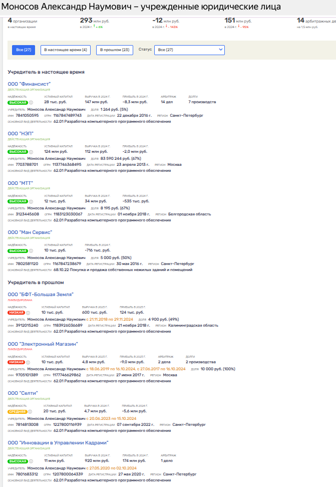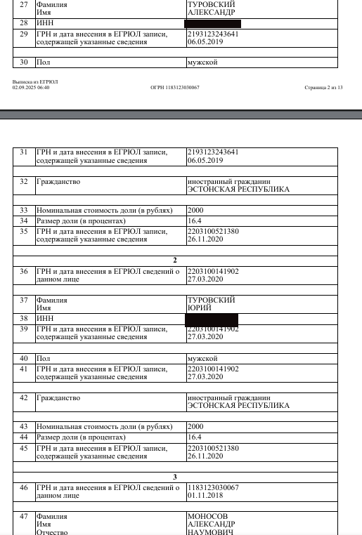 Но вернёмся к нашему Моносову, который Александр. На его балансе доли в четырех компаниях, три из которых работают в сфере it. По двум компания г-н Моносов - партнёр семейства Туровских. Оба они - граждане не дружественной РФ Эстонии.
