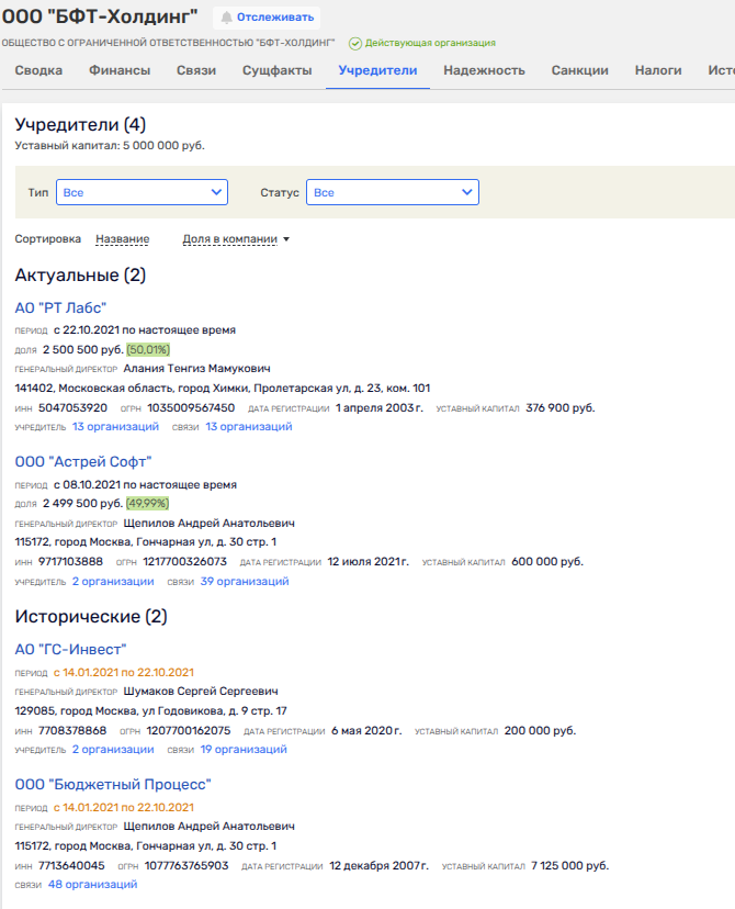 На сегодня ООО «Бюджетные и финансовые технологии» (БФТ) принадлежит ООО «БФТ-Холдинг», коим владеет АО «РТ-Лабс» из дивизиона Ростелекома и некое «Астрей Софт». А до 2021 года владельцем ООО «БФТ-Холдинг» была компания Мацоцкого.