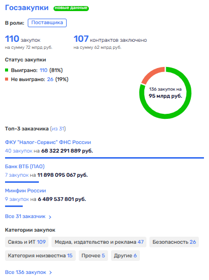 Один из самых крупных экс-активов миллиардера - это компания «Рубитех», которое напилило 95 млрд рублей на госзакупках. И 68,3 млрд рублей их них были от ФКУ «Налог-сервис». Последний контракт подмахнули уже после начала уголовного дела в отношении руководства.