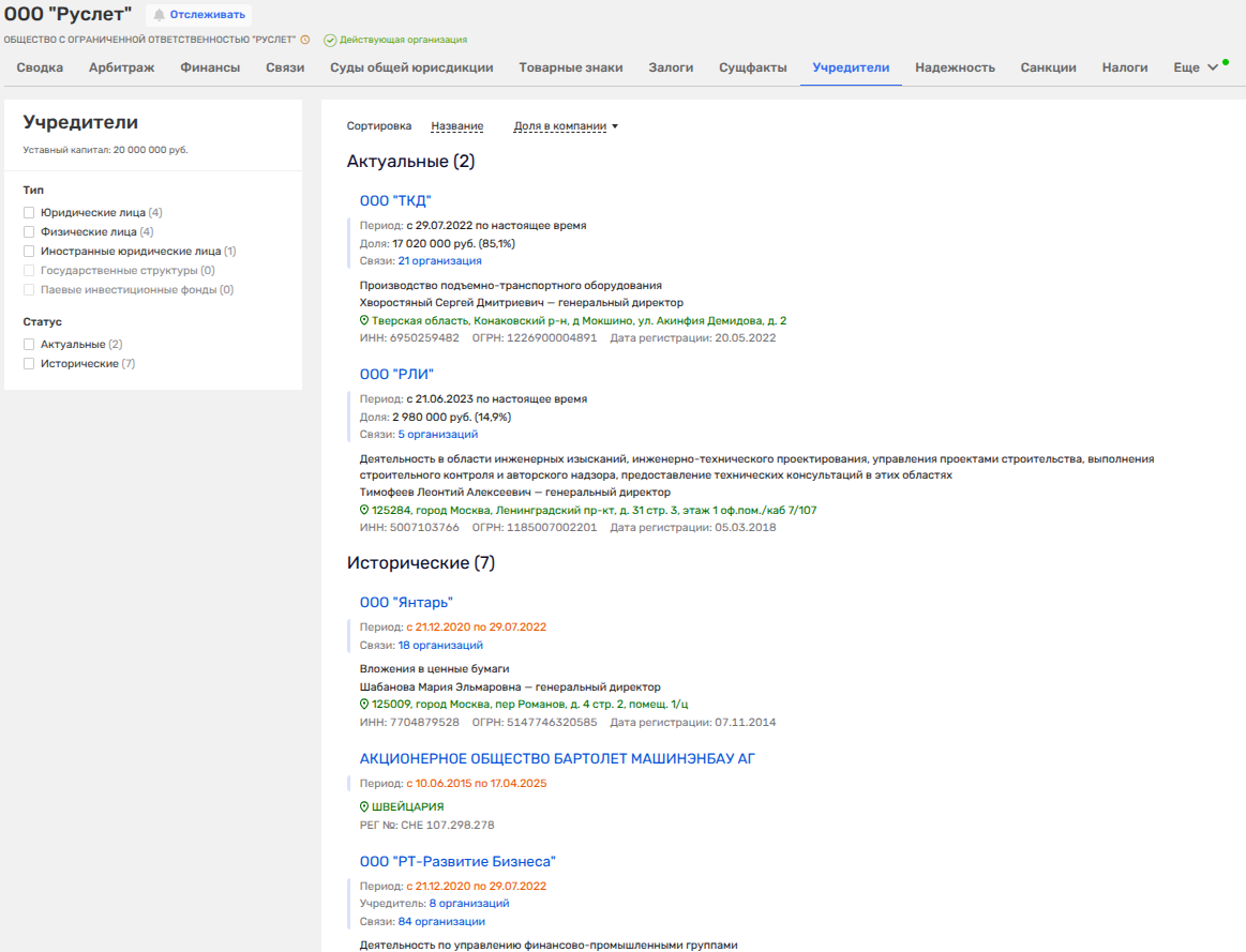 У основания же ООО «Руслет» стояло не только правительство Москвы, но и госкорпорация Ростех в лице дочернего «РТ-Развитие капитал», что вышло из числа собственников лишь июле 2022 года. Интересно и то, что в числе владельцев долей успели побывать близкие к гендиректору КАМАЗА Сергею Когогину и самому КамаЗу люди - Ваган Баблоян и Михаил Бройтман (через ООО «Янтарь»), а Ростех, как мы помним, отметился как главный акционер КАМАЗ.