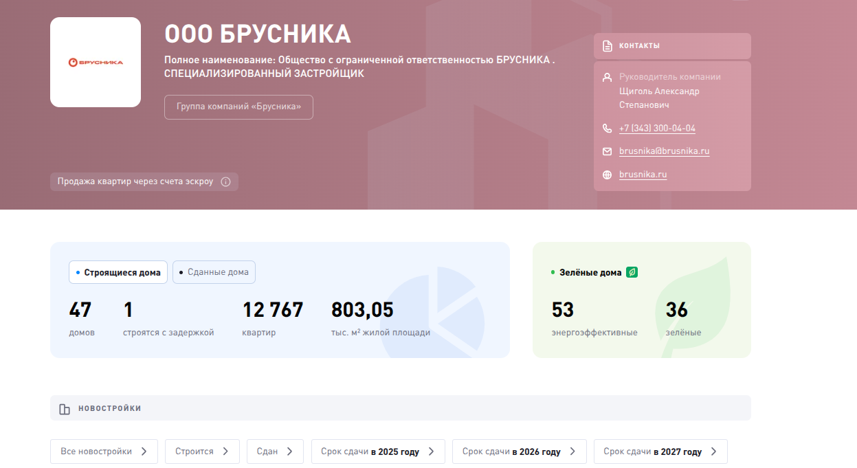 Застройщиком объекта выступает ООО «Брусника», а генпродрядчиком - ООО «Брусника.Организатор строительства». Обе фирмы из дивизиона ГК Брусника. При этом в базе Минстроя РФ указано, что один из 47 своих объектов она возводит со срывом сроков.