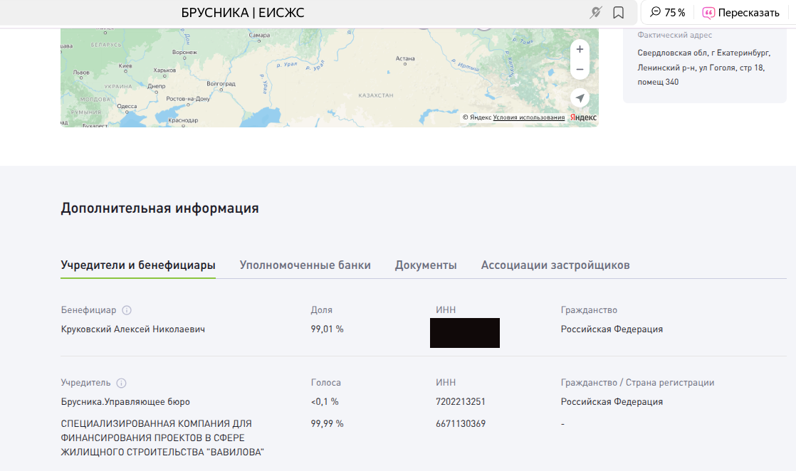 ООО «Брусника», созданная в Екатеринбурге в 2011 году, была объектом более 600 проверок надзорных органов и по ним было 131 нарушение. В частности, в 2021 году при проверке Главного управления строительства Тюменской области было обнаружено девять нарушений, в том числе тот факт, что не обеспечен замкнутый профиль для наружного угла вертикальных конструкций, наблюдается вытекание цементного состава через элементы опалубки, что влияет на качество готовых железобетонных конструкций (изменение водоцементного соотношения для бетона, уменьшение защитного слоя, оголение заполнителя).