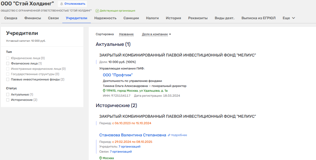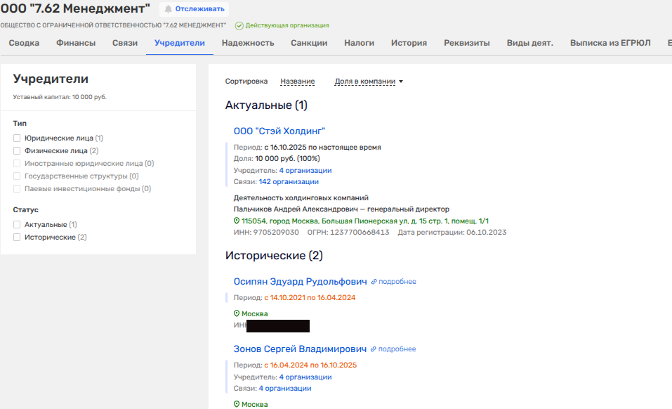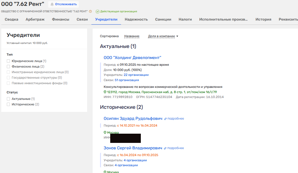 В феврале 2025 года ООО «7.62 Рент» также приобретает ООО «Надус» из сферы техобслуживания автомобилей. Видимо, в тех самых гаражах, купленных ранее.