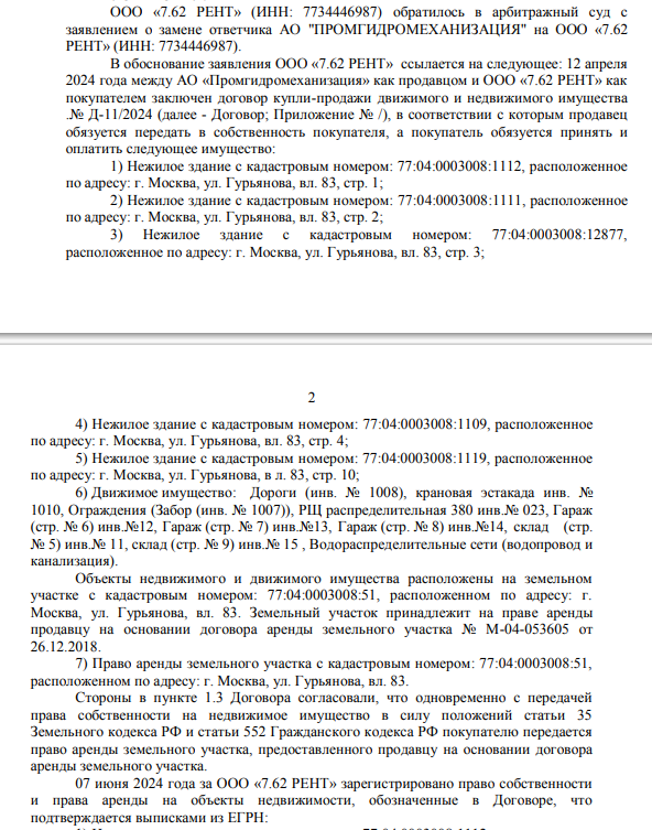 И тут как чертик из табакерки появляется ООО «7.62 Рент», требуя заменить ответчика на себя и заявив, что еще в апреле 2024 года купило у АО пять зданий на ул. Гурьянова, вл. 83, стр 1, 2, 3, 4 и 10, а также движимое имущество - дороги, гаражи, склад, водораспределительные сети, а также к нему перешло право аренды муниципального участка площадью 22289 кв. м. О, как!
