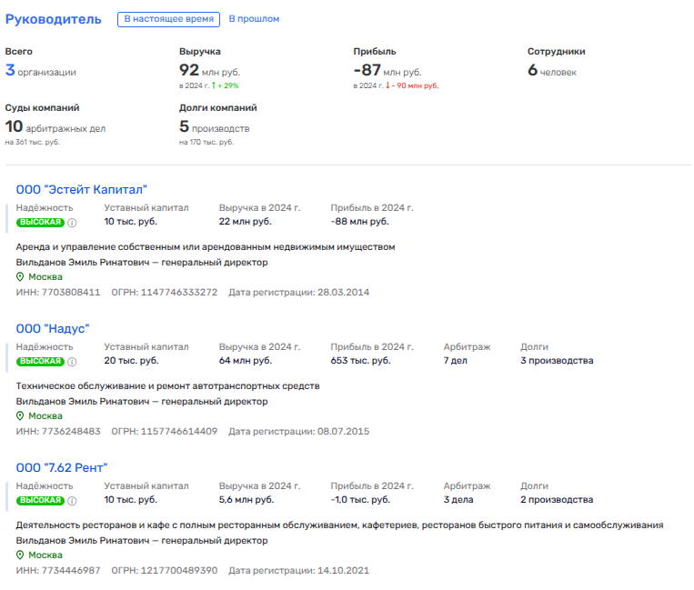 Тогда же, в апреле 2024 года директором «7.62 Рент» становится Эмиль Вильданов - весьма не чужой семье Тё человек. Он является с 2023 года директором фирмы Германа Тё - «Эстейт Капитал». То есть переход права на здания происходил под контролем человека Тё Вильданова.
