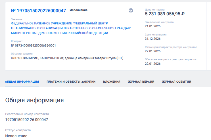 И вот, 21 января 2026 года Федеральный центр планирования и организации лекарственного обеспечения граждан Минздрава России подмахивает три госконтракта с двумя фирмами, ставшими единственными участниками тендеров: с «Нанолеком» - на 1 млрд рублей и 573 млн рублей, а также с «Фармстандартом» - на 5,2 млрд рублей.