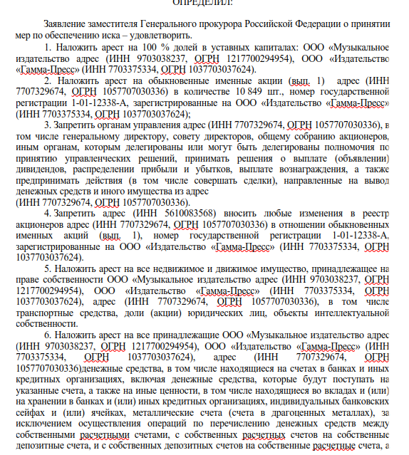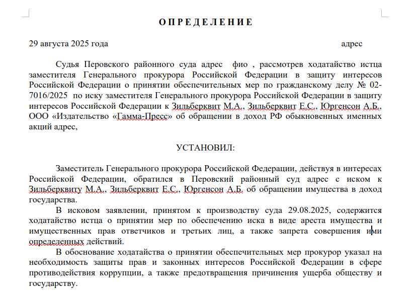 11 сентября Перовский суд Москвы начнет рассмотрение иска Генпрокуратуры в Марку Зильберквиту, его супруге Елене и дочери делового партнера Анастасии Юргенсон, которая также имеет общий бизнес с семьей. Истец требует взыскать в доход государства акции АО «Издательство «Музыка», а также 100% долей в уставном капитале ООО «Издательство “Гамма-Пресс» и ООО «Музыкальное издательство П. Юргенсон».