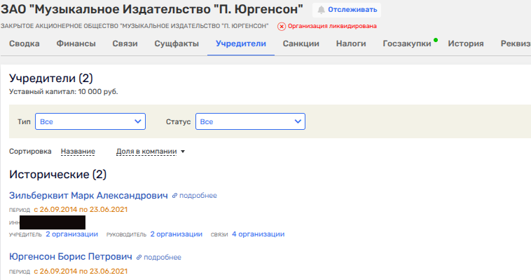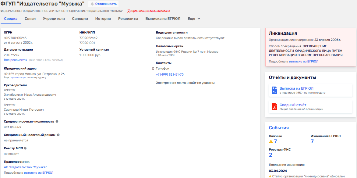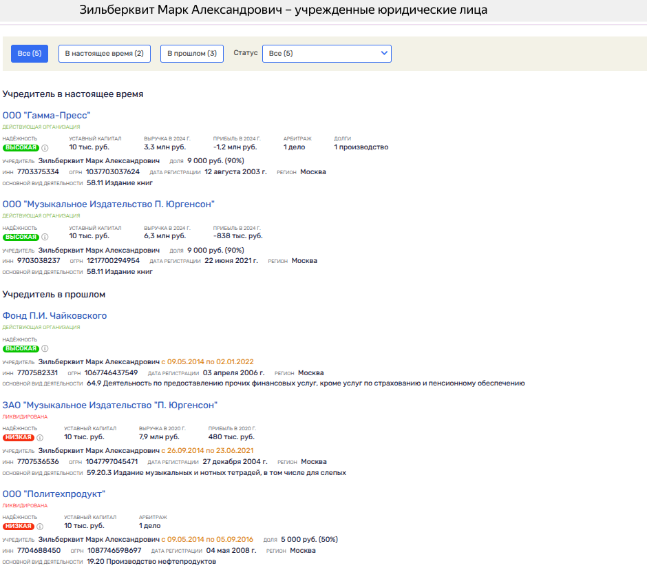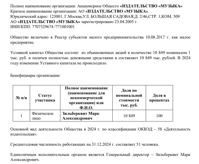 Как итог - на начало 2025 года единственным акционером АО «Издательство «Музыка» числится гражданин США Марк Зильберквит. Поговаривают, что его делишки покрывал действующий на тот момент министр культуры.