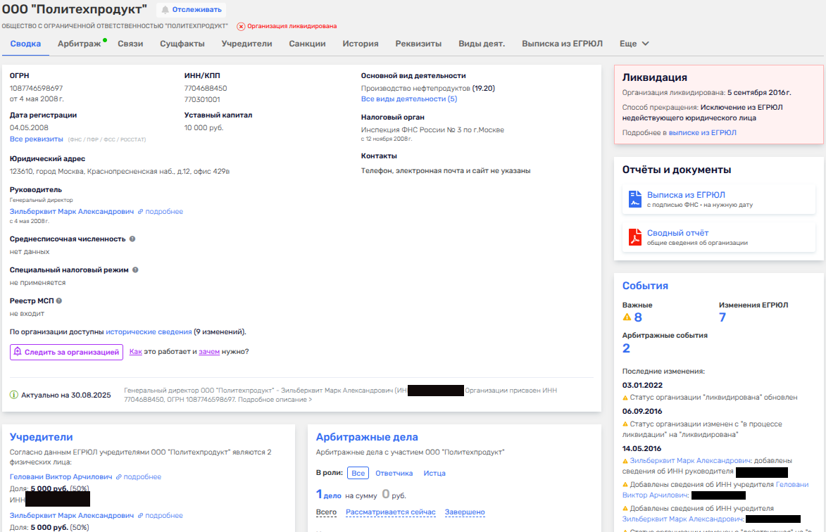 В 2008 году он сделал попытку влезть в такую денежную сферу как производство нефтепродуктов, учредив ООО «Политехпродукт». Фирма просуществовала до 2016 года, но, судя по всему, выполняла роль выводной кубышки, имея некие дела в Бельгии.