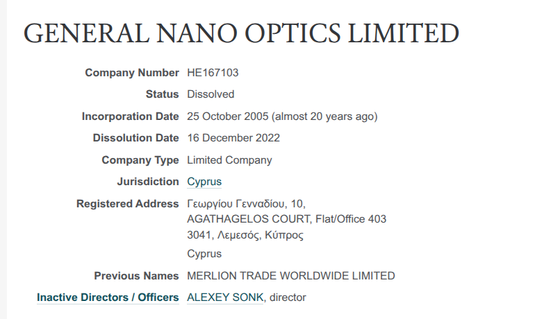 Руководителем фирмы с таким названием, прописанной на Кипре, выступает ALEXEY SONK, а сама компания ранее имело наименование - MERLION TRADE WORLDWIDE LIMITED. На Сонка также оформлена американская Alteriver Inc. По этой же фирме с ним руководителем проходит VIACHESLAV SOSINKIY, который был одно время директором АО «Мейджерпак Рус». Оное в свою очередь было учреждено при участие кипрской НЕОЦИНК ТЕХНОЛОДЖИ ЛИМИТЕД.