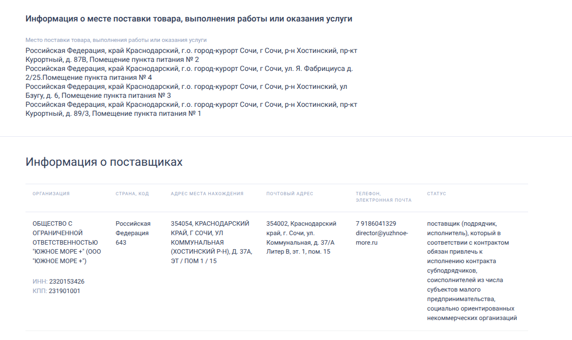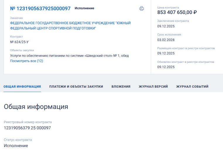 9 декабря 2025 года федеральное государственное бюджетное учреждение «Юг Спорта» (Южный федеральный центр спортивной подготовки) подмахнуло госконтракт на питание в Сочи на сумму 853 млн рублей. Кормить спортсменом и прочих до 3 февраля 2028 года будет единственный участник соответствующего тендера - ООО «Южное море+» из Сочи.