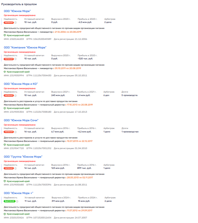 Так, ранее руководителем победителя последнего тендера выступала некая Ирина Маспанова, которая и выводит на эту паутину ликвидантов из сферы общепита, получавших контракты всё того же ФГБУ «Юг Спорта». Среди них - ООО «Южное море», ООО «Компания Южное море», ООО «Южное море и КО», ООО «Южное море Сочи», ООО «Группа Южное море». Часть этих компаний ликвидированы после того проверки выявили у них нарушения санитарного законодательства.