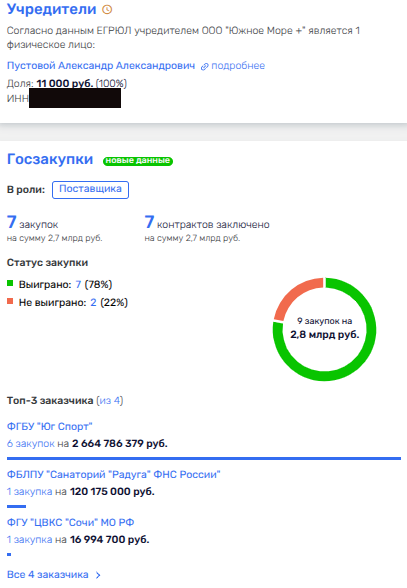 Что касается ООО «Южное море+», то оно было учреждено в 2007 году и имеет копеечный уставный капитал в 11 тыс. рублей. Выручка фирмы за 2024 год - 311 млн рублей, а на госконтрактах за все время она нарубала 2,7 млрд рублей, из которых 2,66 млрд рублей как раз таки обеспечило ФГБУ «Юг Спорта».
