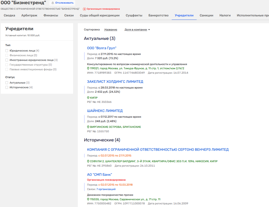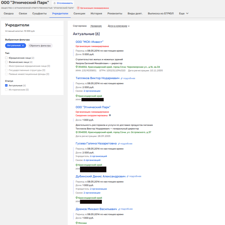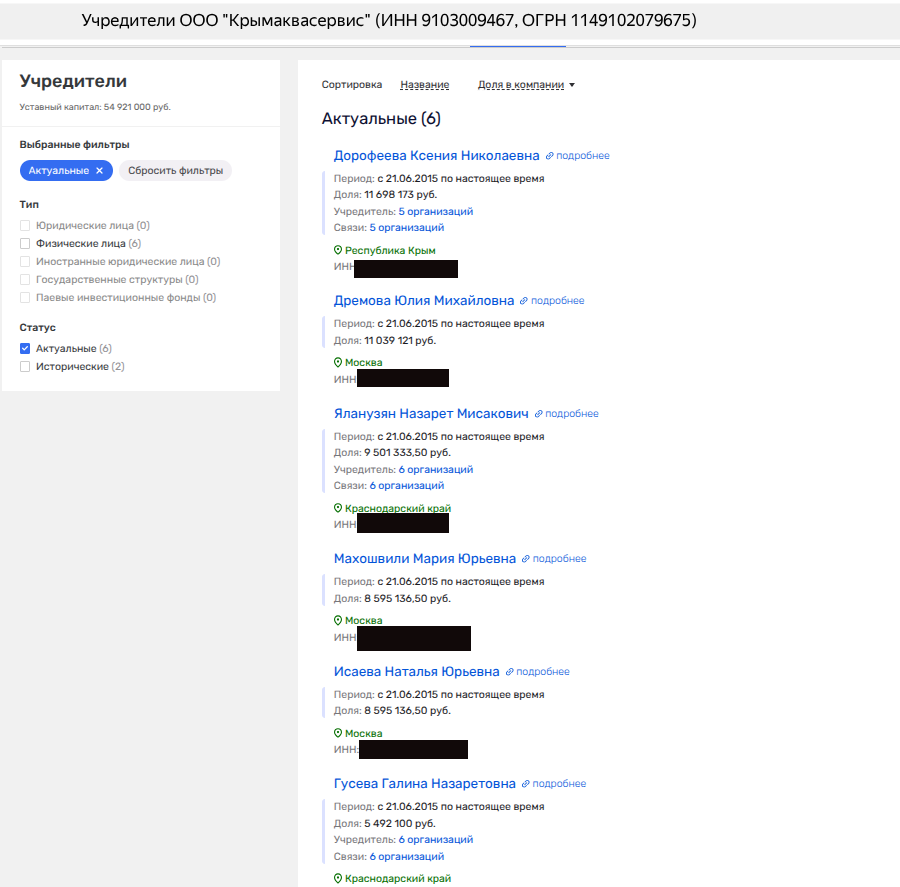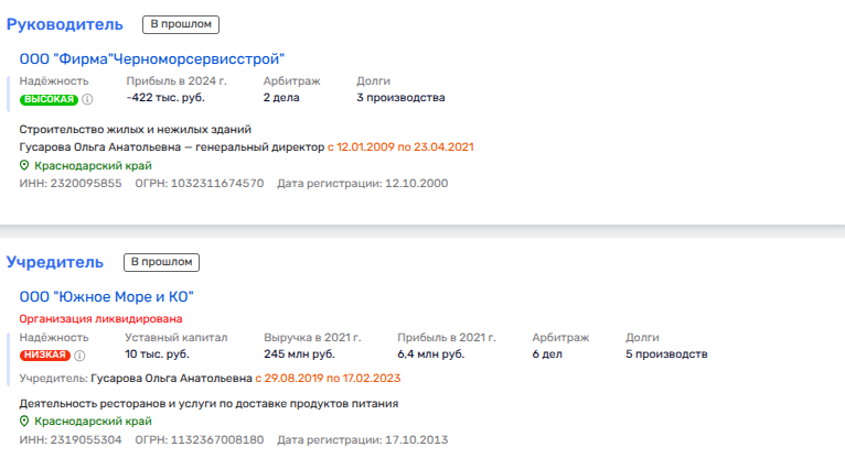 ООО «Южное море и КО» приказало долго жить в июле 2024 года, успев получить госконтрактов на 23 млн рублей, из которых 22,4 млн - от уже знакомого ФГБУ «Юг Спорта». В числе совладельцев ликвиданта мы видим всю ту же Маспанову, а также некую Ольгу Гусарову, которая была также руководителем ООО «Фирма Черноморсервисстрой». В числе бывших владельцев последнего отметилось ООО «Бизнестренд» - актив компании «Волга Груп», связанной как с олигархом Геннадием Тимченко, так и с бывшим банком братьев Ротенбергов - СМП Банком. Там же мы наблюдаем и пачку офшоров.