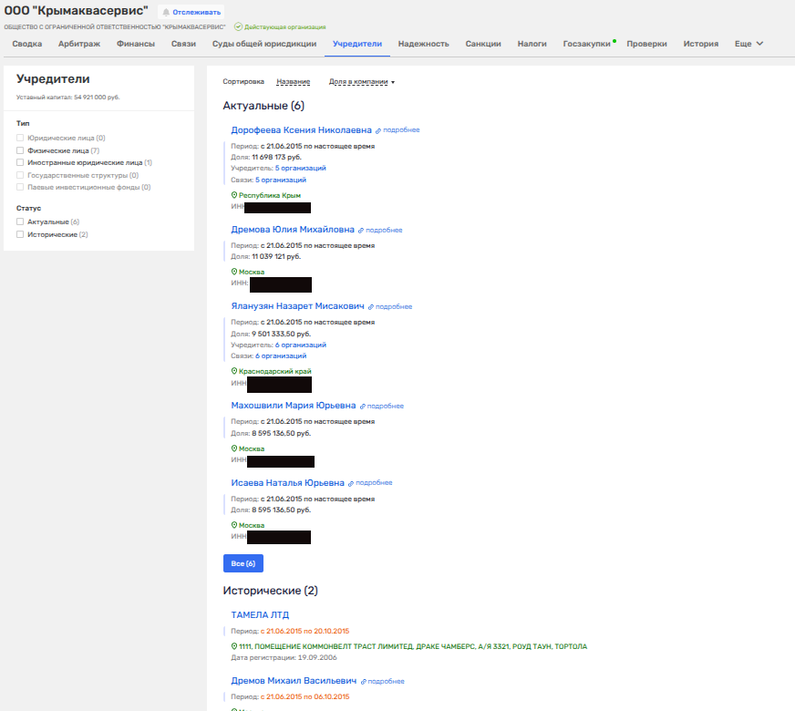 И, наконец, мы переходим к самой токсичной фирме в бизнес-портфеле Дремова - ООО «Крымаквасервис» из Ялты, а точнее теперь его семьи, ведь свою долю он передал некой Юлии Михайловне Дремовой (дочери?). Но когда сам владел долей партнером выступал еще и офшор - некое ТАМЕЛА ЛТД с о. Тортола. Может туда и уводили капиталы?