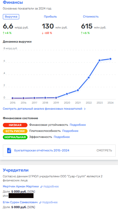 Двумя этими контрактами фирме практически обеспечили годовой оборот, а прибыль уж точно: по итогам 2024 года ООО показывало выручку на 6,6 млрд рублей и чистую прибыль - 130 млн рублей.