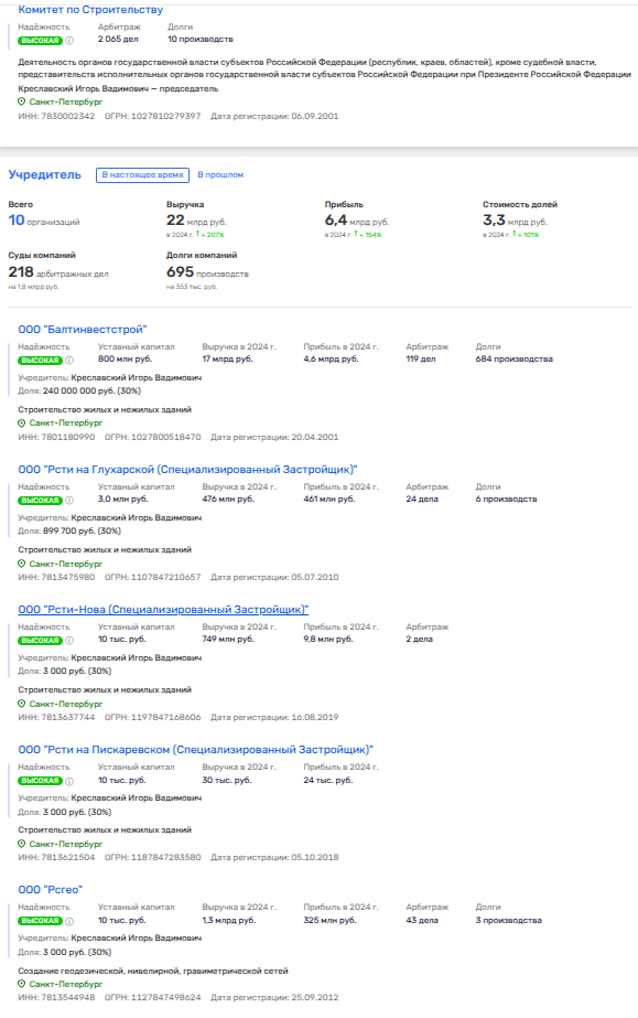 Так, например, в июне 2025 года Санкт-Петербургское государственное бюджетное учреждение «Мостотрест», подконтрольное комитету имущественных отношений СПБ, подмахнуло госконтракт на 1,109 млрд рублей на завершение работ по Свердловской набережной. Единственным участником соответствующего тендера тогда стало ООО «РСГ», где 30% имеет сам Креславский, остальные доли - у его родни.