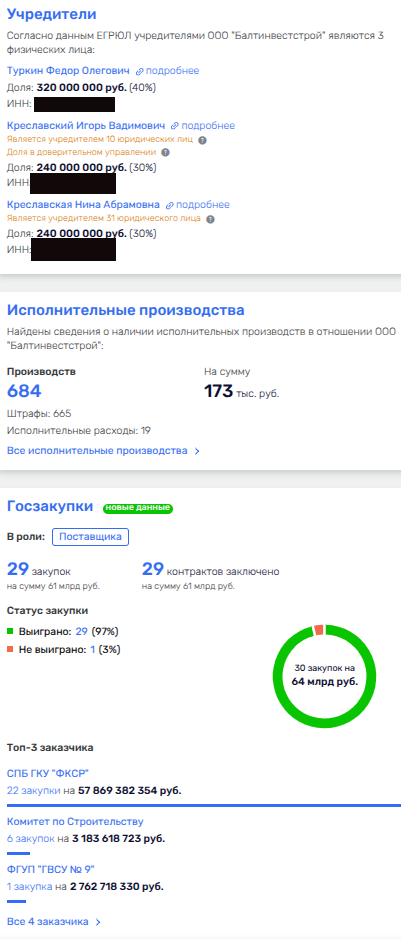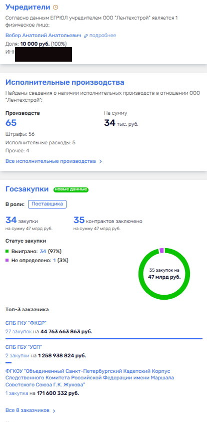 Что мы видим в сухом остатке: Креславский и Фаталиев при молчаливом попустительстве Беглова весело попиливают бюджетные миллиарды на строительных госконтрактах, не стесняясь отщипывать в свой карман. Ведь у госфонда в топ-е подрядчиков совершенно официально - ООО «Суар-Групп» друзей Фаталиева, ООО «БАЛТИНВЕСТСТРОЙ» семьи Креславских и «Лентехстрой», связанный с последними.
