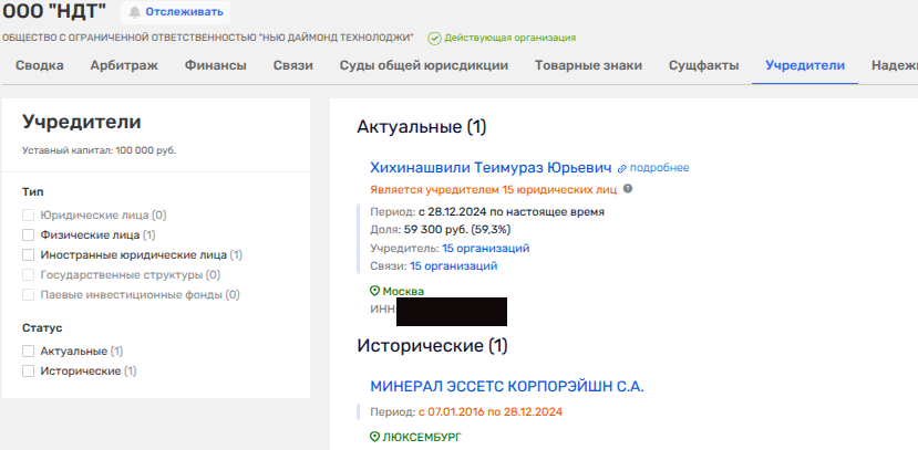 Офшор до 28 декабря 2024 года был владельцем ООО «Нью Даймонд Технолоджи» (НДТ) из Сестрорецка (Санкт-Петербург), которое занимается разработкой технологии промышленного производства алмазных пластин для применения в электронике нового поколения. После офшора владельцем 59,3% доли является Теймураз Хихинашвили (председатель Израильско-российского делового совета), то есть партнер Миндича по офшору! У кого же оставшаяся доля НДТ?