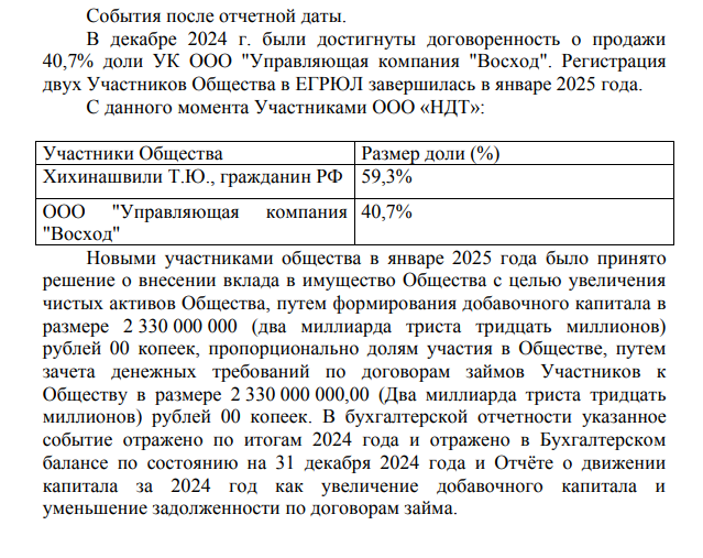 В отчетности НДТ за 2024 год указано, что еще в декабре 2024 года были достигнуты договоренность о продажи 40,7% доли ООО "Управляющая компания "Восход" и регистрации долей в январе 2025 года, но в ЕГРЮЛ Хихинашвили все еще остается единственным раскрытым владельцем. При этом речь в документах уже о более чем 2 млрд рублей инвестиций. Потанин не захотел светить свои уши в такой скандальной кубышке?