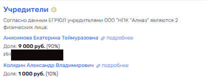 Автографы поставила АО «Механика» из госкорпорации Ростех, власти Владимирской области и Научно-производственный комплекс «Алмаз». В последнем долю имеет Александр Колядин - технический директор НДТ, наемный персонал Хихинашвили. А основной владелец НПК - Анисимова Екатерина Теймуразовна, вероятно, дочь Теймураза Хихинашвили.