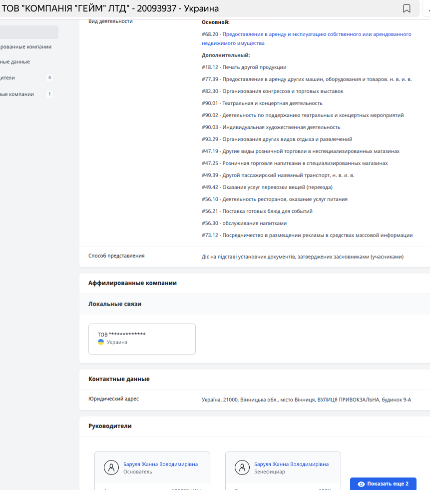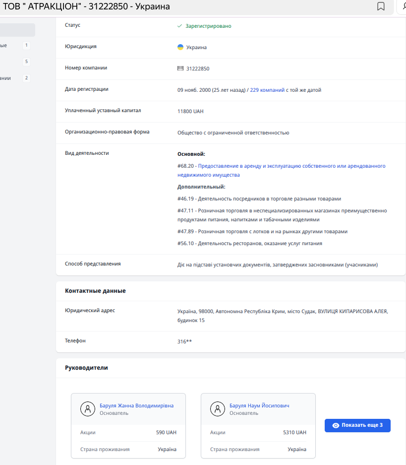Кстати, именно в Винницкой области ведет бизнес теща Борзова - супруга Наума Барули Жанна, на которую записано ТОВ «КОМПАНІЯ "ГЕЙМ" ЛТД». А еще на ней - фирма в крымском Судаке — ООО «Аттракцион», которой она владела вместе с мужем. На сегодня фирма действующая, вот только записана на пачку малопримечательных физлиц. Метод «прикрылся ширмой» ведь никто еще не отменял.