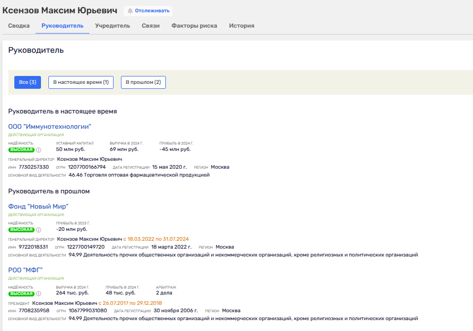 С февраля 2024 года Максим Ксензов также является директором ООО «Иммунотехнологии», которое было учреждено для оптовой торговли фармпродукцией в 2020 году.