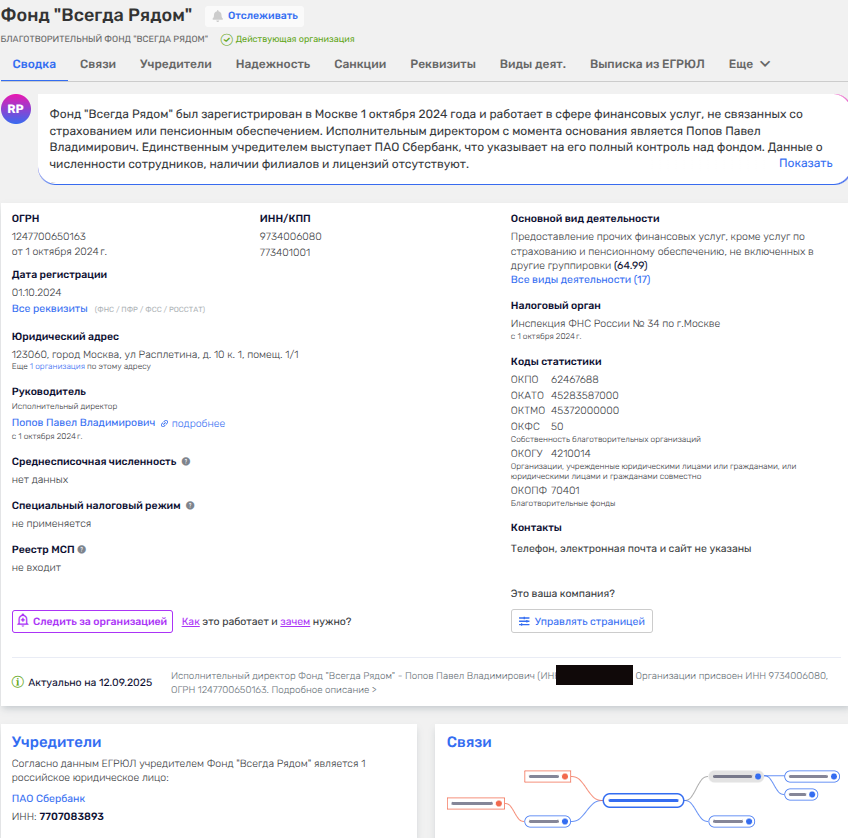 В пользу версии, что фирма, приютившая Ксензова, все еще имеет отношение к Грефу, говорит и то, что прописана она вместе с фондом «Всегда рядом», учрежденным Сбербанком в 2024 году.
