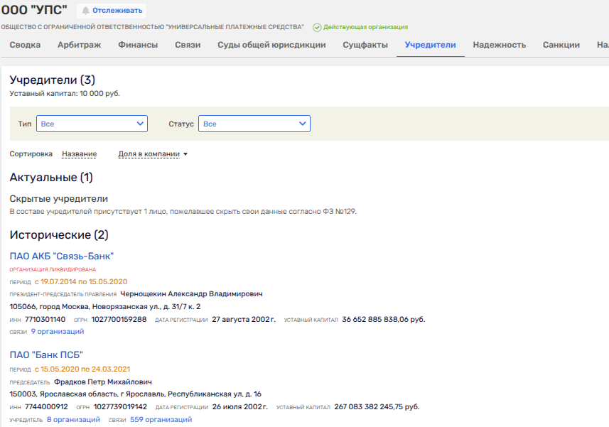 Между тем вместе с фондом прописано ООО «Универсальный платежные системы» - поставщик услуг для Ростелекому. УПС также скрывает своих владельцев, но ранее последним раскрытым собственником как раз и был Промсвязьбанк, который был изъят у скандально известных братьев Ананьевых и перешёл государству.