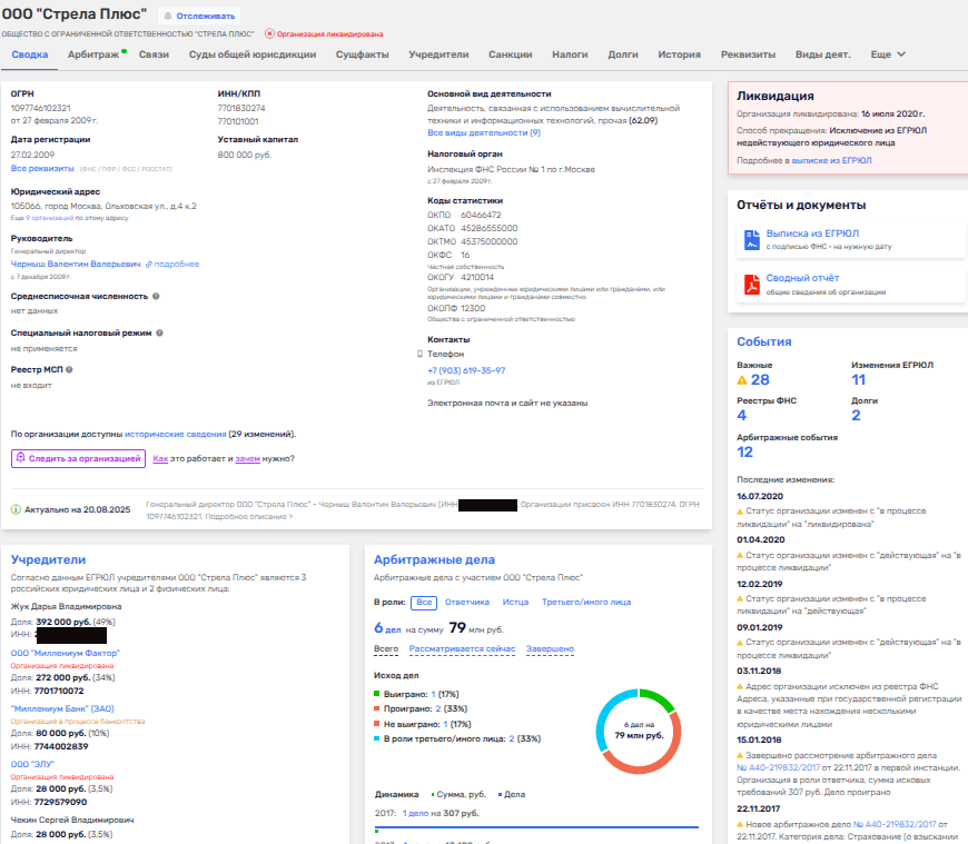 Валентин Черныш вплоть до ликвидации в 2020 году был директором ООО «Стрела Плюс», долю в котором имел Миллениум Банк и связанные с ним юрлица.