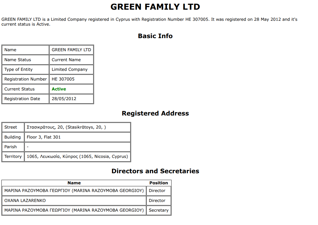 Более того, некая OXANA LAZARENKO числится директором GREEN FAMILY LTD до сих пор. По другим источникам, офшор вроде как летом 2024 года прихлопнули, но это не точно.
