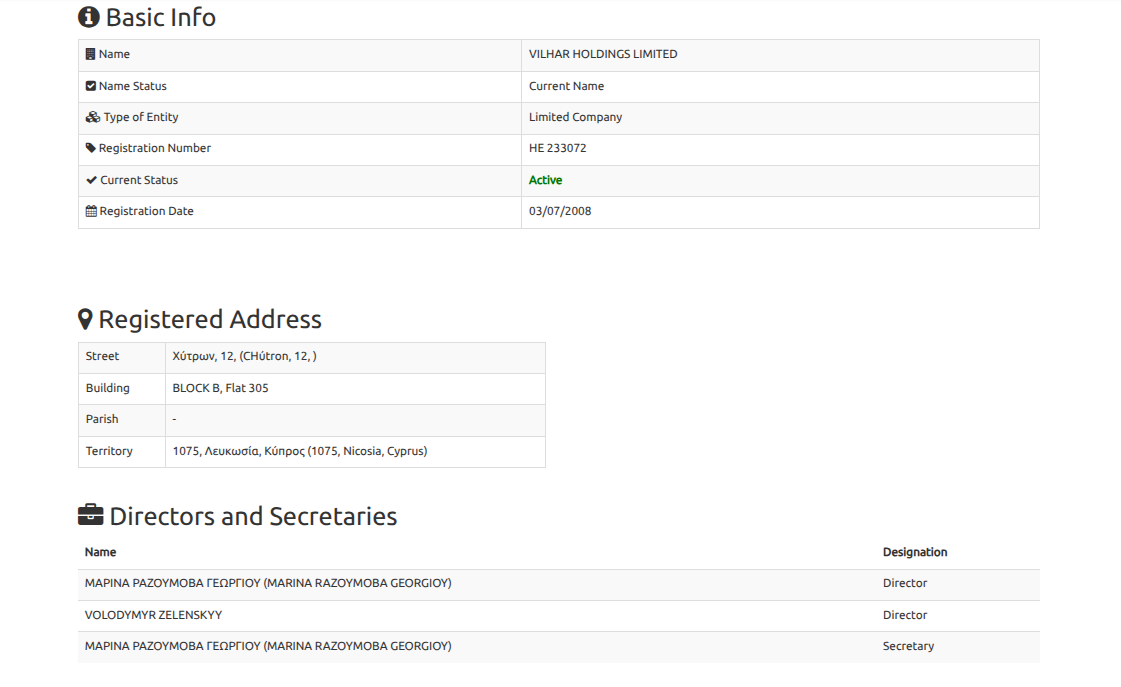 Но самая яркая вишенка на этом торте вот в чем: в руководстве GREEN FAMILY LTD вместе с Лазаренко наследила некая MARINA RAZOYMOBA GEORGIOY, которая по другой кипрской кубышке - VILHAR HOLDINGS LIMITED (существовало с 2008 по 2021 год) была связана с самим Зеленским (VOLODYMYR ZELENSKYY). При этом на даму оформлена до сих пор целая пачка действующих кипрских фирм. Например, D.A. GREENS HOUSE LIMITED, коим руководит вместе с некой SVETLANA SHTEPA. Светлана Штепа - российская актриса. Совпадение?