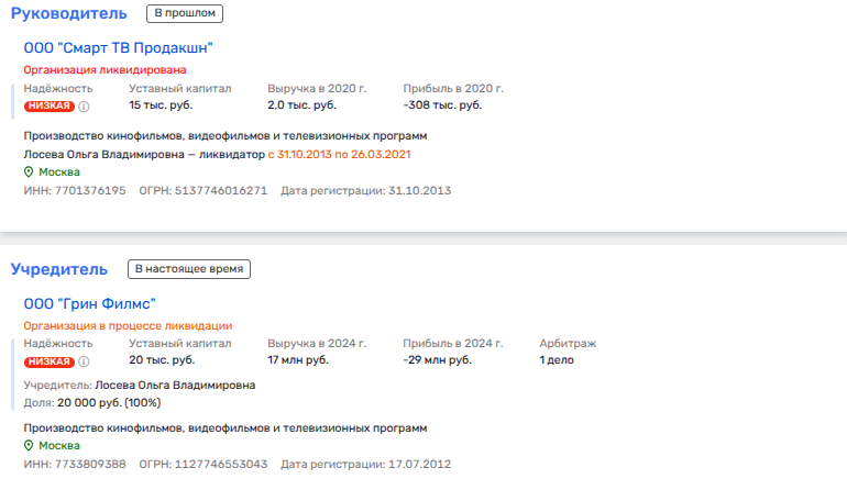 Сам же кипрский офшор вышел из фирмы уже после начала СВО - в апреле 2022 года. На место как бы владельца поставили ширму - некую Ольгу Лосеву. При этом мадам Лосева была директором «Смарт ТВ Продакшн» аж с 2013 года, то есть это человек из той же шатии-братии.