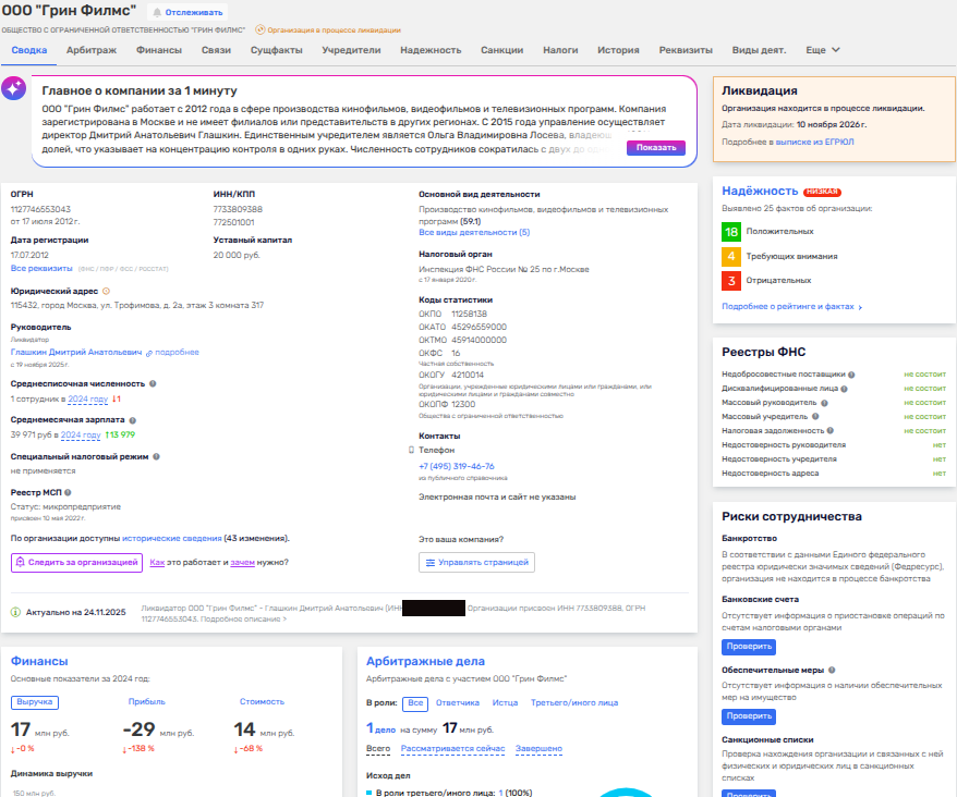 С ноября 2025 года, как полыхнул скандал в Киеве, фирму «Грин Филмс» и вовсе решили пустить под нож. Заметают следы после того, как актив использовали для мутных делишк?