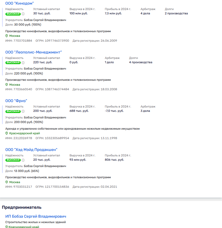 За 2024 год ООО «Кинодом» принес бенефициарам (коим может быть и вовсе не Бобза) 100 млн рублей выручки. Более того, ранее Федеральный фонд социальной и экономической поддержки отечественной кинематографии спонсировал проект Бобзы на 20 млн рублей.