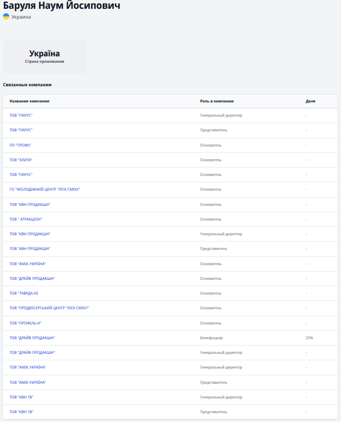 Баруля, постоянно проживающий в Киеве, но имеющий российское гражданство - директор программы «КВН», генеральный директор ООО «АМиК Украина», а также давний соратник Зеленского по той же Лиге Смеха. На него о сих пор в Киеве оформлена пачка фирм.