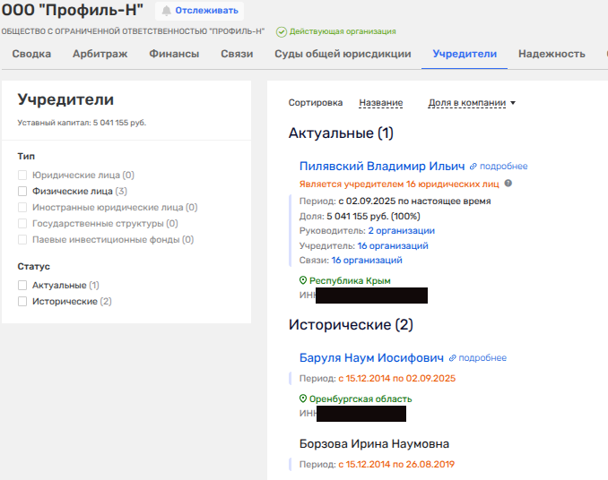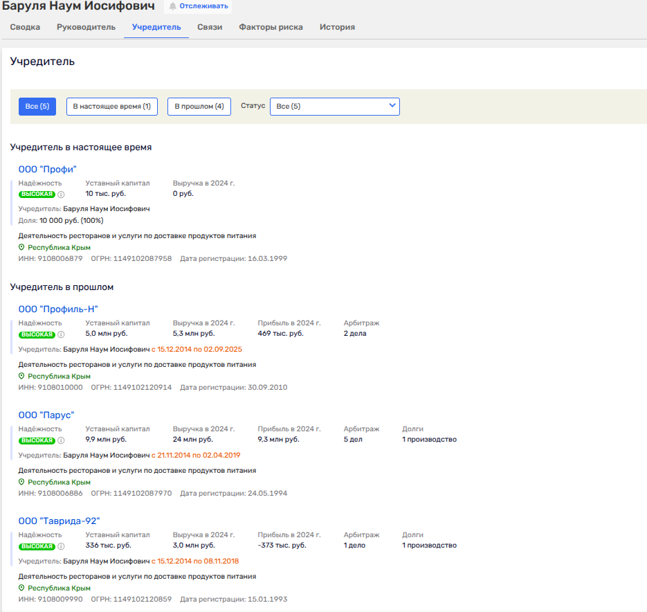 На сегодня у Барули в Крыму есть вполне себе действующий актив - ресторанное ООО «Профи» в Судаке, а до сентября 2025 года он владел и аналогичным активом ООО «Профиль-Н». Передан тот, вероятно, ширме, так как у обоих фирм остался один и тот же директор - Лариса Клокова. Эта же дама была ранее руководителем ресторанного ООО «Кант». Сейчас в последнем долю имеет Артур Соколов - до января 2024 года он был главой ГУП "Курорты Запорожской области". Как вам такой расклад?