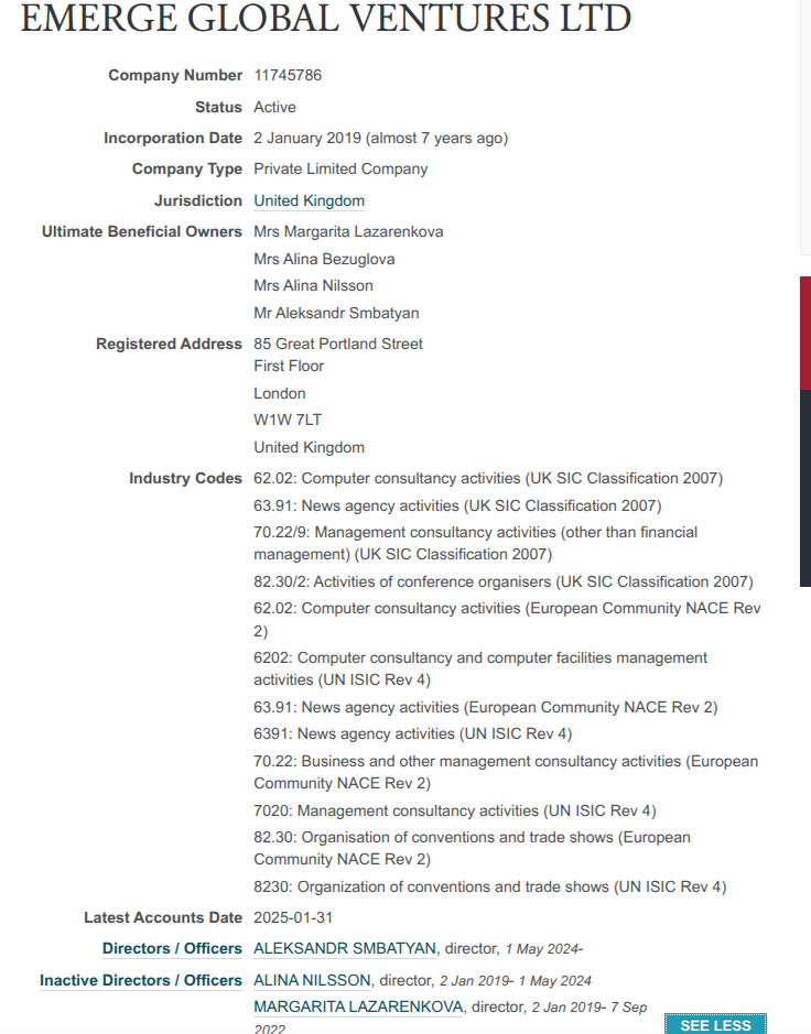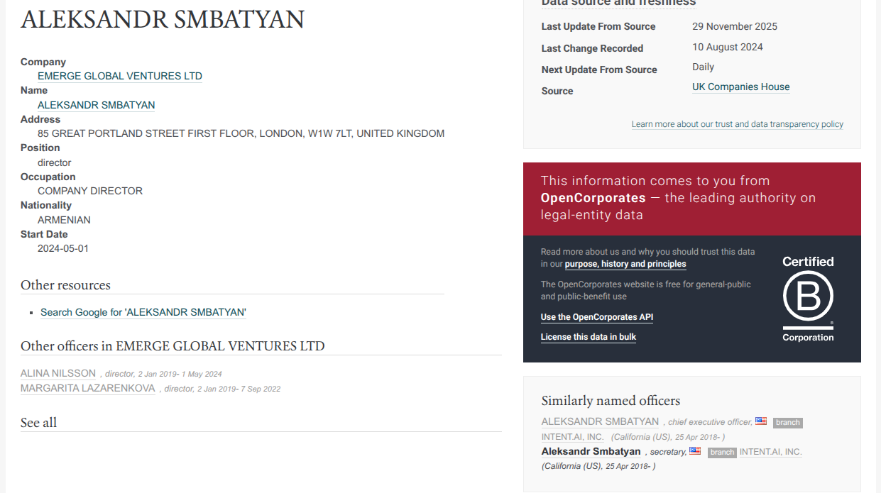 С 2024 года Смбатян - директор и бенефициар лондонской фирмы EMERGE GLOBAL VENTURES LTD и у него же обнаружились такая действующая американская фирма с пропиской в Калифорнии, как INTENT.AI, INC. То есть Смбатян вполне официально платит налоги в не дружественных России странах, которые спонсируют банду Зеленского, обстреливающую мирных жителей российских городов. И это на минуточку советник вице-мэра Москвы!