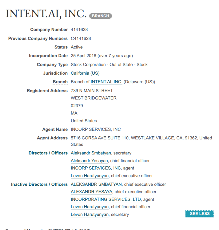 Среди руководства INTENT.AI, INC мы видим и некоего Левона Арутюняна (Levon Harutyunyan) — тезку армянского актера. Именно на г-не Harutyunyan числится еще одна пачка юрлиц в США, в том числе созданных в 2023 году. Например, APEX ACCOUNTING FIRM INC. Актер выполняет роль ширмы для Смбатяна в остальной паутине американского бизнеса?